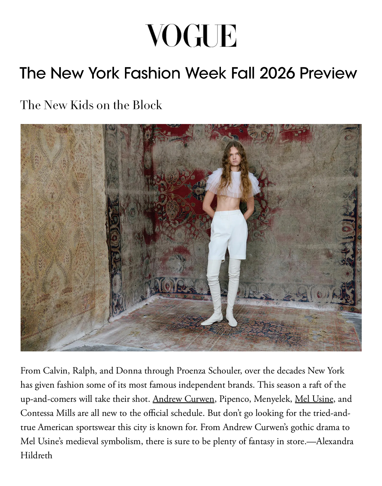 V Magazine - 1.18.26 "V Girls: Zoe Bleu on Dracula, Love, and What Comes Next" by Christian Rosa Vogue - 2.6.26 "The New York Fashion Week Fall 2026 Preview: The New Kids on the Block" by Alexandra Hildreth